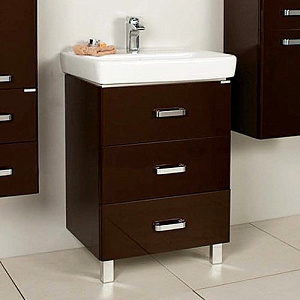 Современная лаконичная модель тумбы AQUATON Америна 60 М с тремя ящиками имеет ширину 60 см и выполнена в тёмно-коричневом цвете. Корпус изготовлен из влагостойкой ЛДСП, а фасад - из высококачественной МДФ. Модификация на двух изящных ножках подойдет для ванных комнат, где нельзя использовать подвесную мебель. Направляющие нижнего крепежа обеспечивают жёсткое и надежное крепление ящиков, а встроенные доводчики гарантируют их бесшумное и плавное закрывание. Дополнительно организовано нижнее подключение труб водоснабжения и канализации. Корпус и фасады покрыты полиэфирной краской ультрафиолетового отверждения, обеспечивающей дополнительную защиту от влаги. Тумбу дополнит раковина Santek Тигода 60.