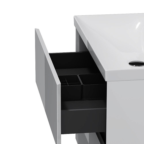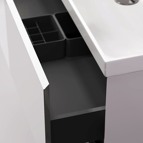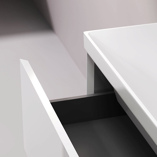 Подвесная база Above от AM.PM — баланс форм в актуальной минималистичной эстетике с утонченным силуэтом. Коллекция Above играет с пространством создавая ощущение лёгкости и простора. Это достигается за счет аккуратного запила фасада и корпуса под углом 45°. Каждая линия работает на эффект невесомости и создаёт ощущение простора даже в компактной ванной комнате. Дизайн разработан студией DanelonMeroni (Великобритания / Италия) и отражает философию коллекции — максимум визуального эффекта без лишних деталей. Выдвижной ящик из ЛДСП толщиной 12 мм имеет антискользящее покрытие. Съёмный органайзер в комплекте позволяет рационально организовать пространство а пластиковый обвод сифона сохраняет полезный объём. Направляющие Pull-out с механизмом Soft Close обеспечивают плавное и бесшумное закрывание превращая ежедневное использование мебели в приятный ритуал. Фасады окрашены глянцевой итальянской эмалью в 7 слоёв обеспечивая насыщенный и глубокий цвет. Такое покрытие устойчиво к ежедневной эксплуатации и надолго сохраняет премиальный внешний вид. ""