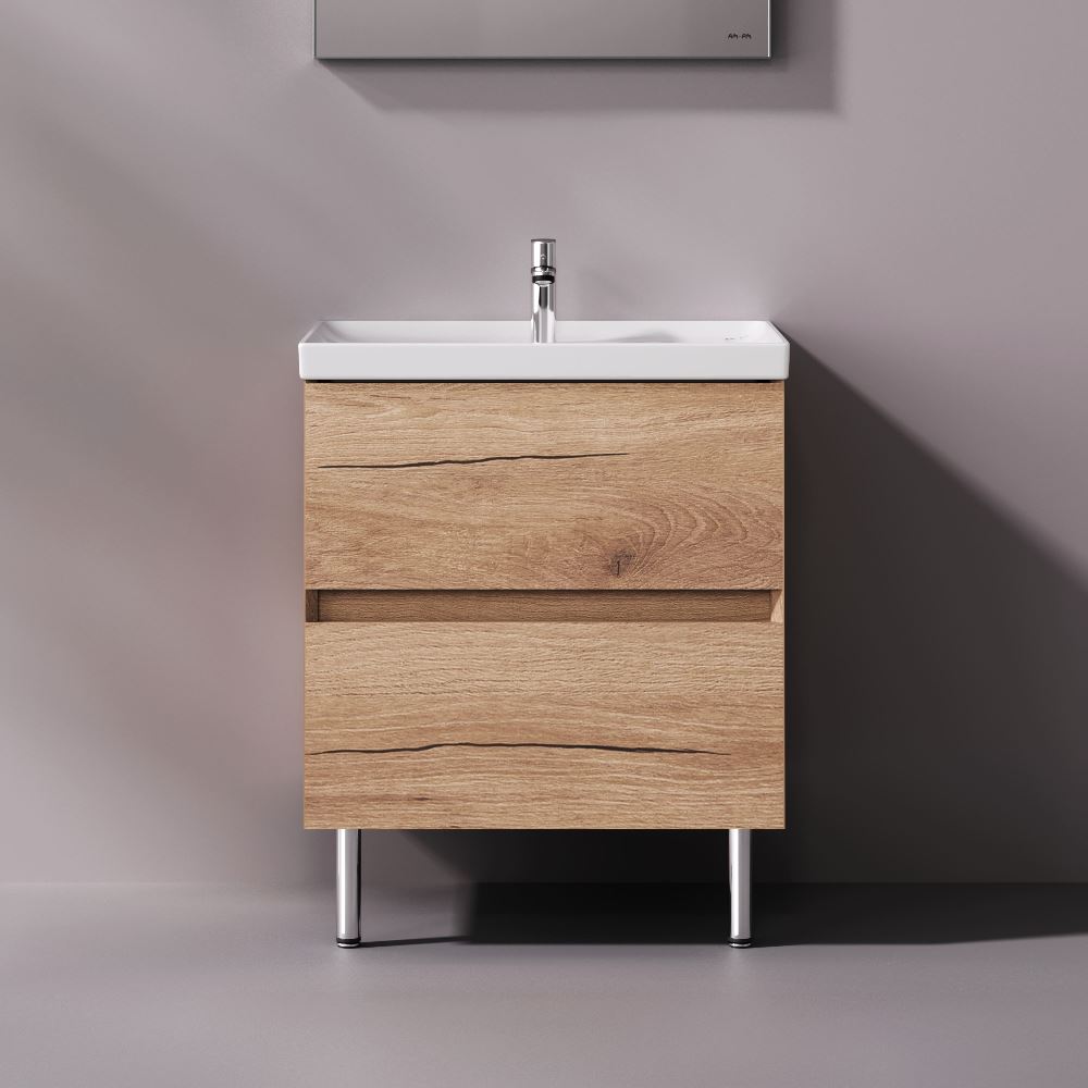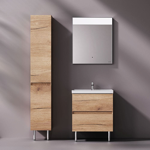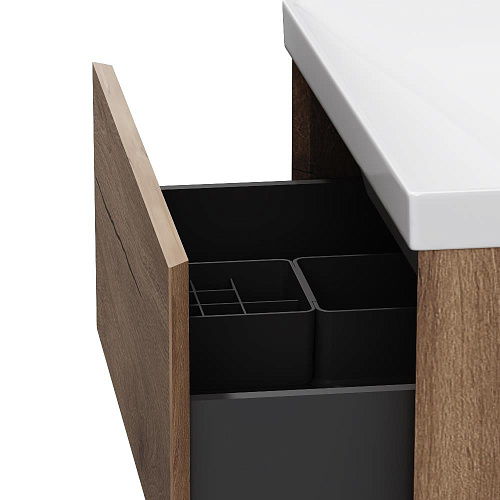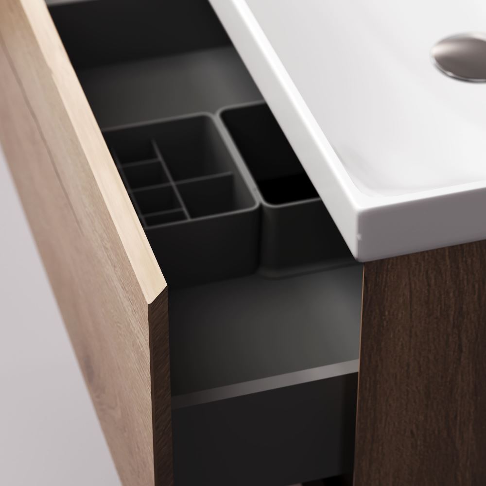 Напольная база под раковину Above — баланс форм в актуальной минималистичной эстетике с утонченным силуэтом. Коллекция Above играет с пространством создавая ощущение лёгкости и простора. Это достигается за счет аккуратного запила фасада и корпуса под углом 45°. Каждая линия работает на эффект невесомости и создаёт ощущение простора даже в компактной ванной комнате. Дизайн разработан студией DanelonMeroni (Великобритания / Италия) и отражает философию коллекции — максимум визуального эффекта без лишних деталей. Выдвижной ящик из ЛДСП толщиной 12 мм имеет антискользящее покрытие. Съёмный органайзер в комплекте позволяет рационально организовать пространство а пластиковый обвод сифона сохраняет полезный объём. Направляющие Pull-out с механизмом Soft Close обеспечивают плавное и бесшумное закрывание превращая ежедневное использование мебели в приятный ритуал. Покрытие под текстурированное дерево разработано эксклюзивно студией DanelonMeroni. Тёплый глубокий цвет и выразительный древесный рисунок подчеркивают архитектурное настроение коллекции придавая интерьеру современный и премиальный характер на долгие годы. ""
