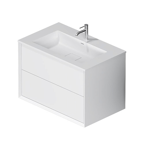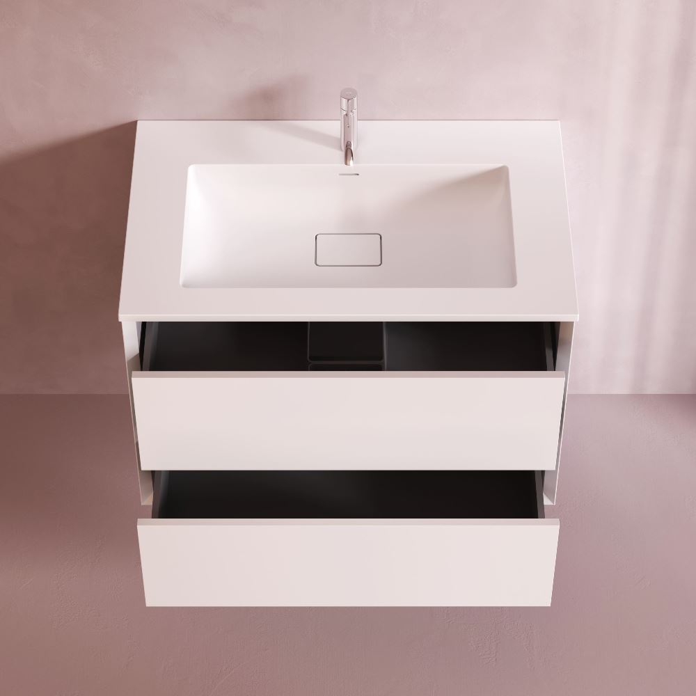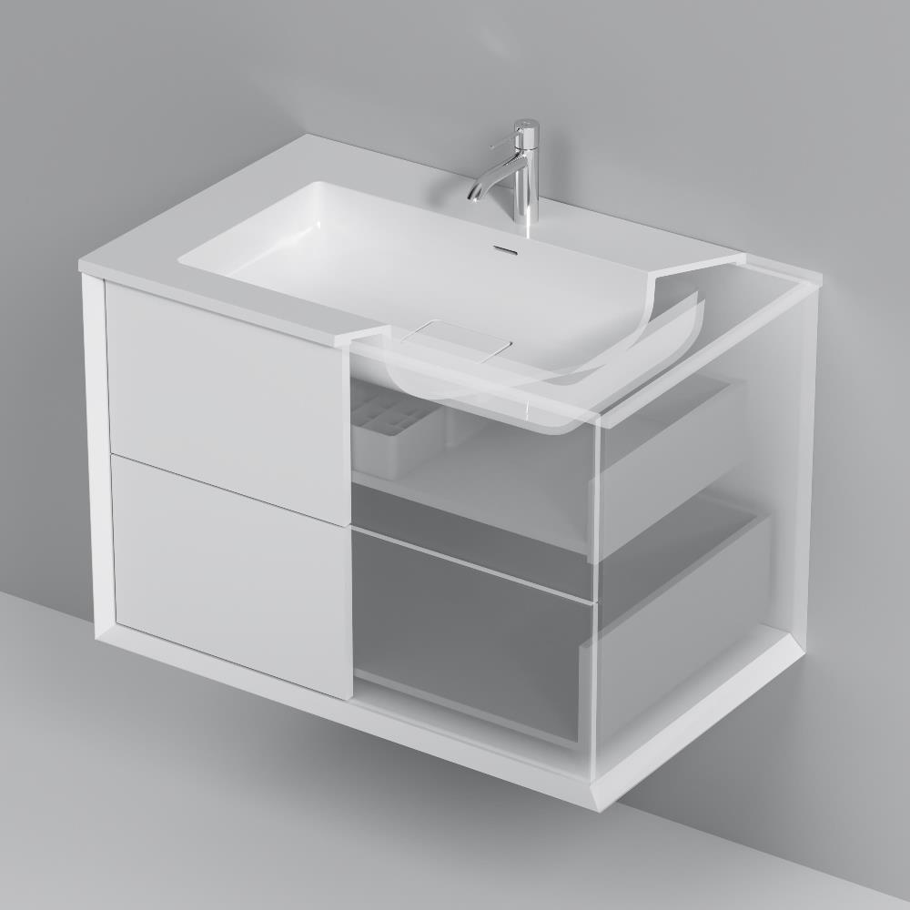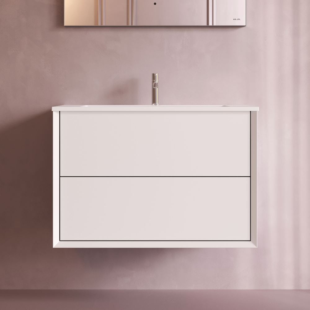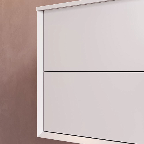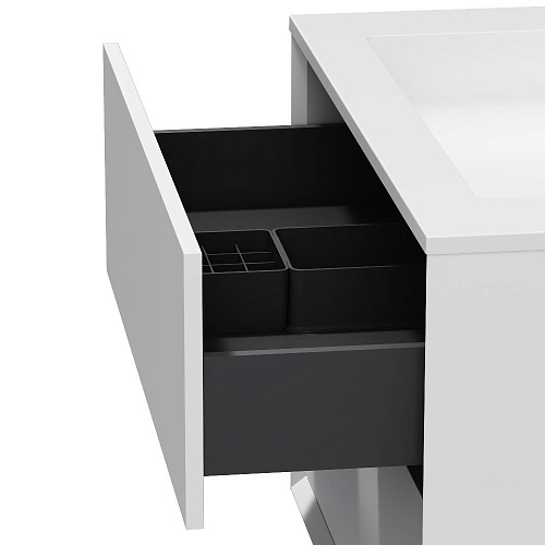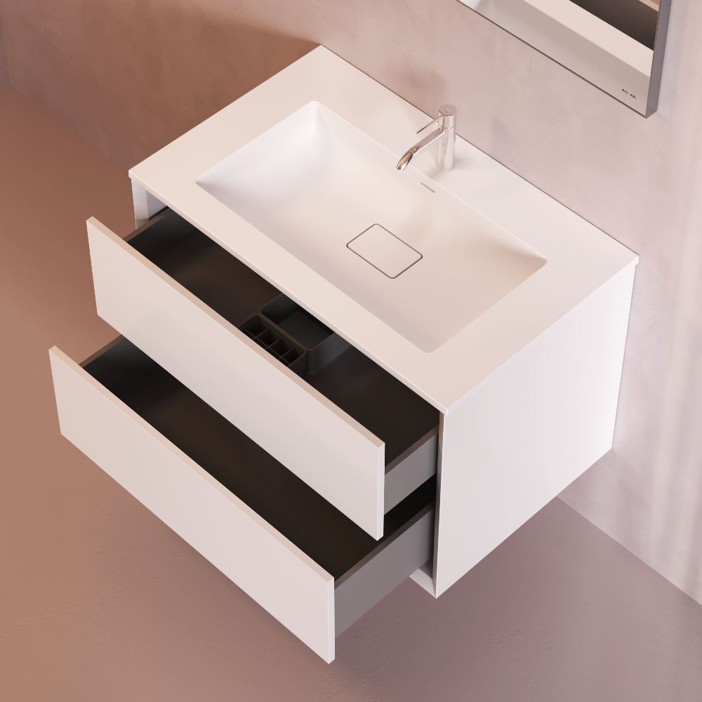 Подвесная база под раковину Libre — современный минимализм в мебельной линейке AM.PM. Разработанная студией DanelonMeroni (Великобритания / Италия) коллекция Libre переосмысливает современный минимализм через призму итальянского дизайна воплощая философию максимального визуального эффекта без лишних деталей. Архитектура корпуса — одна из ключевых особенностей модели. Боковины толщиной 22 мм с аккуратным запилом под углом 45° формируют тонкий выверенный фрейм подчёркивающий чистоту линий и сдержанную изящность тумбы. Функциональность продумана до мелочей. Выдвижной ящик из ЛДСП толщиной 12 мм сохраняет баланс между прочностью и визуальной лёгкостью а антискользящее покрытие внутри делает хранение более аккуратным. Съёмный органайзер входящий в комплект обеспечивает удобную организацию хранения при этом пластиковый обвод сифона позволяет сохранить максимум полезного объёма. Направляющие Push-to-Open с синхронизатором позволяют открывать ящик лёгким нажатием в любой точке фасада. Финишное покрытие выполнено матовой итальянской эмалью нанесённой в 7 слоёв. Оно формирует насыщенный и глубокий цвет устойчивый к повседневной эксплуатации и сохраняющий безупречный внешний вид на протяжении долгого времени. ""