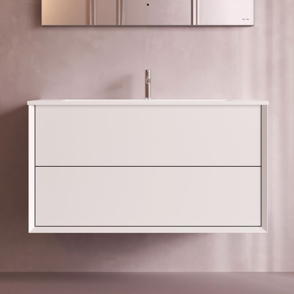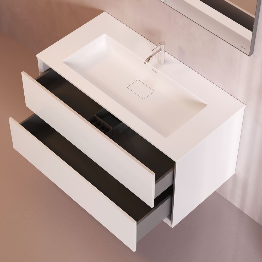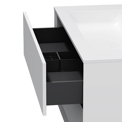 Подвесная база под раковину Libre — современный минимализм в мебельной линейке AM.PM. Разработанная студией DanelonMeroni (Великобритания / Италия) коллекция Libre переосмысливает современный минимализм через призму итальянского дизайна воплощая философию максимального визуального эффекта без лишних деталей. Архитектура корпуса — одна из ключевых особенностей модели. Боковины толщиной 22 мм с аккуратным запилом под углом 45° формируют тонкий выверенный фрейм подчёркивающий чистоту линий и сдержанную изящность тумбы. Функциональность продумана до мелочей. Выдвижной ящик из ЛДСП толщиной 12 мм сохраняет баланс между прочностью и визуальной лёгкостью а антискользящее покрытие внутри делает хранение более аккуратным. Съёмный органайзер входящий в комплект обеспечивает удобную организацию хранения при этом пластиковый обвод сифона позволяет сохранить максимум полезного объёма. Направляющие Push-to-Open с синхронизатором позволяют открывать ящик лёгким нажатием в любой точке фасада. Финишное покрытие выполнено матовой итальянской эмалью нанесённой в 7 слоёв. Оно формирует насыщенный и глубокий цвет устойчивый к повседневной эксплуатации и сохраняющий безупречный внешний вид на протяжении долгого времени. ""