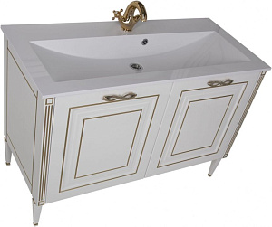 Тумба под раковину на ножках Aquanet Паола 120 186114 с двумя распашными дверцами и внутренней полкой из ударопрочного стекла. Классические формы в сочетании с передовыми технологиями. Фрезеровку и пилястры золотого цвета дополняют изящные и устойчивые к воздействию влаги и истиранию ручки итальянского разработчика мебельной фурнитуры Sagittario. Благодаря механизму доводчиков дверцы закрываются бесшумно и легко. Тумба предназначена для использования в ванных комнатах с повышенной влажностью. Соответствует стандартам безопасности.