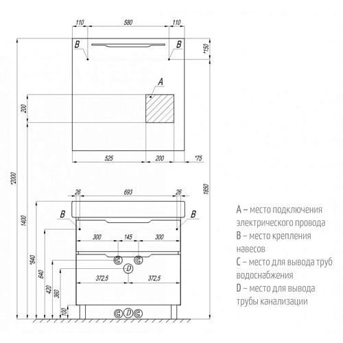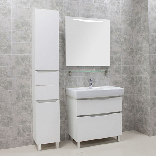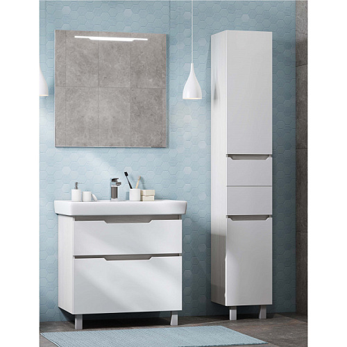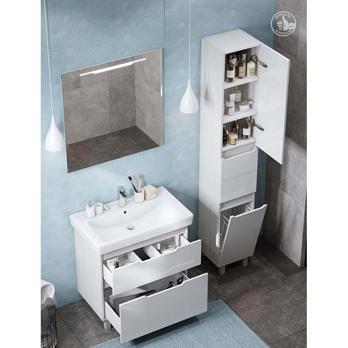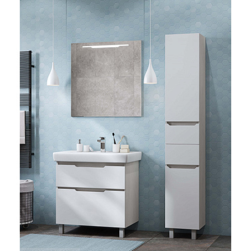 Стильная и современная тумба Дакота 80 идеально впишется в ванную комнату практически любого размера. Дизайн модели не предусматривает лицевую фурнитуру - вместо нее на фасадах сделаны удобные вырезы, которые позволяют без труда открыть ящики. Боковые стенки корпуса выполнены из текстурированной ДСП в цвете выбеленное дерево, а фасады тумбы, окрашенные в белый глянец, - из МДФ. Модель имеет два выдвижных ящика, оснащенных направляющими с интегрированной системой плавного закрывания, что обеспечивает дополнительное удобство при использовании.