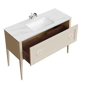Напольная тумба в цвете капучино (бежевый) матовая с одним выдвижным ящиком выполнена из массива ясеня. Вместительный ящик с плавным закрыванием украшен двумя крупными ручками. Сочетается со столешницами PLAZA Classic шириной 120 см. Подходит для установки раковин с типом монтажа накладная на столешницу, встраиваемая снизу и встраиваемая сверху