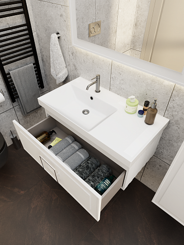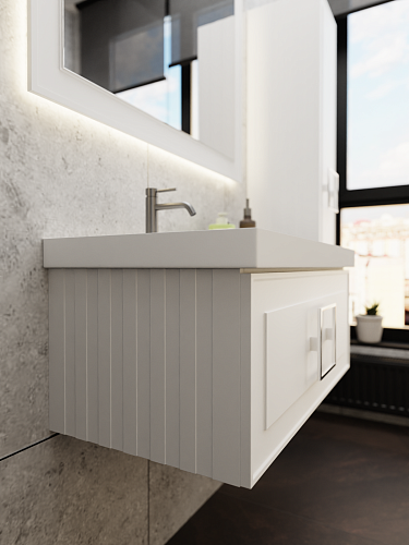 Дизайнеры LA FENICE знают, что подбор сантехники - это творческая задача. С мебелью коллекции Cubo решить задачу будет проще. Матовые фасады подвесных тумб и столешницы в различных цветовых гаммах помогут даже самому взыскательному покупателю создать индивидуальный интерьер. Изящные и утончённые фрезерованные фасады и боковины тумб в сочетании неповторимым цветом молочно-белая станут украшением любой ванной комнаты.