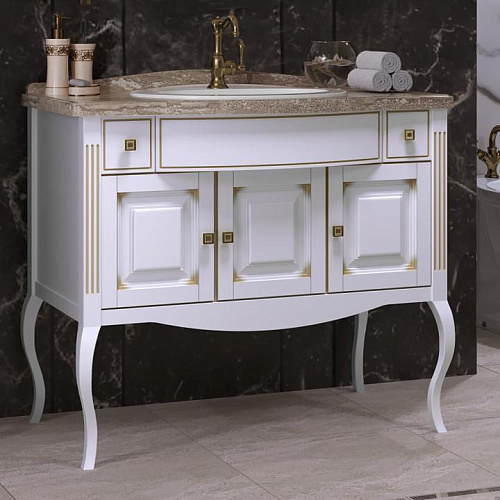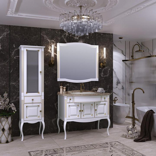 Коллекция ЛАУРА создана нашими дизайнерами в стиле Нео Классика. Коллекция представлена в двух размерах 100 см и 120 см. Фасадные детали изготовлены из массива бука. Особый способ патинирования золотой краской на фасадах придает коллекции дополнительный шарм и очарование. На тумбу из коллекции ЛАУРА можно установить мраморную столешницу с врезной накладной керамической раковиной (для размера 100 см) или раковину из литого мрамора. Особый шик коллекции добавляют золотые и серебряные ручки, инкрустированные кристаллами Swarovski.