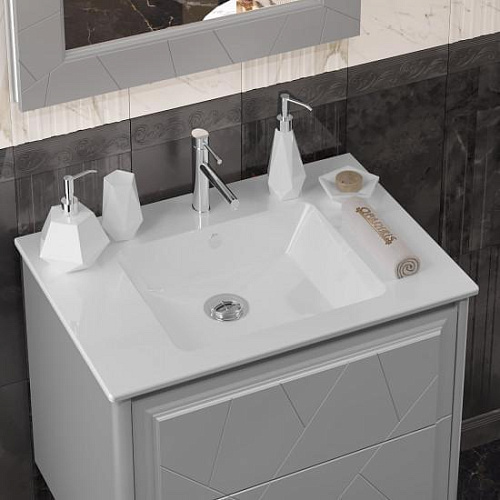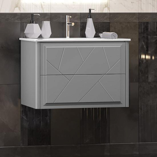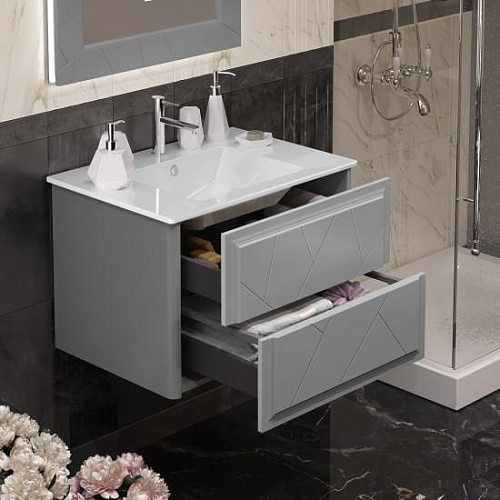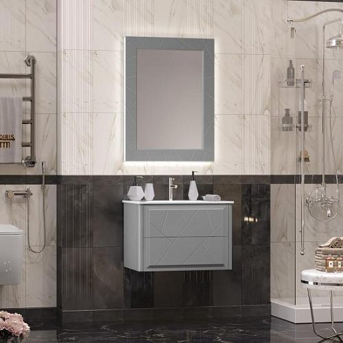 Коллекцию ЛУИДЖИ украшают сложная фрезеровка фасадов строгими линиями и декоративная подсветка по периметру зеркала, которое оснащено сенсорным выключателем. Тумбы дополняются современными ультратонкими керамическими слим-раковинами в размерах 70 см и 90 см. Коллекция изготавливается в цветах Белый матовый и серый матовый. Мебель оснащена механизмами плавного закрывания Hettich (Германия).