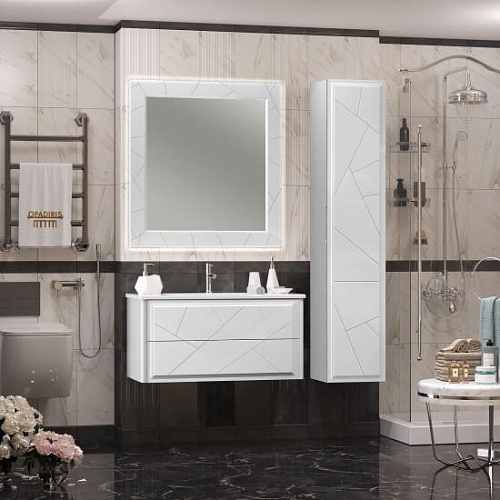 Коллекцию ЛУИДЖИ украшают сложная фрезеровка фасадов строгими линиями и декоративная подсветка по периметру зеркала, которое оснащено сенсорным выключателем. Тумбы дополняются современными ультратонкими керамическими слим-раковинами в размерах 70 см и 90 см. Коллекция изготавливается в цветах Белый матовый и серый матовый. Мебель оснащена механизмами плавного закрывания Hettich (Германия).