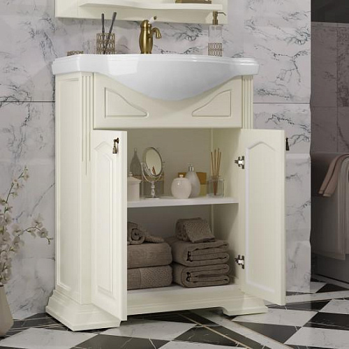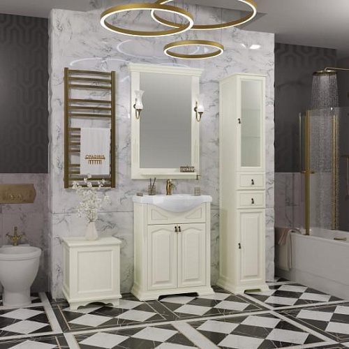 Коллекция РИСПЕКТО символизирует лучше традиции неоклассики в сочетании с необыкновенной функциональностью и простотой дизайна. Успех и уникальность коллекции формируется несколькими вариантами отделок, а также размерным рядом моделей и глубокой керамической раковиной. Завершенность стилю коллекции РИСПЕКТО придают сложные филенчатые фасады мебели. Несколько вариантов пеналов — узкий, стандартный (с бельевой корзиной) и двухстворчатый — удачно завершают комплектацию коллекции. Мебель оснащена механизмами плавного закрывания Hettich (Германия).