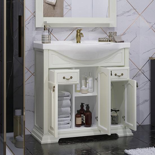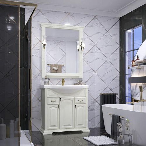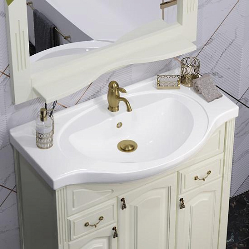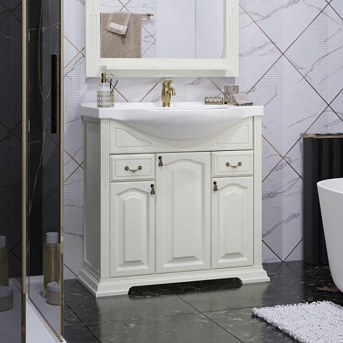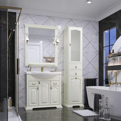 Коллекция РИСПЕКТО символизирует лучше традиции неоклассики в сочетании с необыкновенной функциональностью и простотой дизайна. Успех и уникальность коллекции формируется несколькими вариантами отделок, а также размерным рядом моделей и глубокой керамической раковиной. Завершенность стилю коллекции РИСПЕКТО придают сложные филенчатые фасады мебели. Несколько вариантов пеналов — узкий, стандартный (с бельевой корзиной) и двухстворчатый — удачно завершают комплектацию коллекции. Мебель оснащена механизмами плавного закрывания Hettich (Германия).