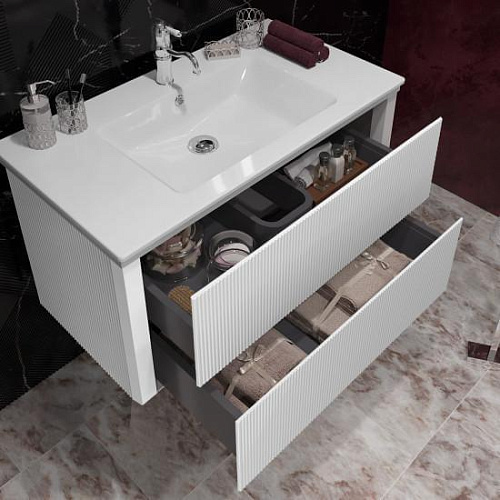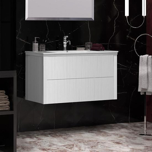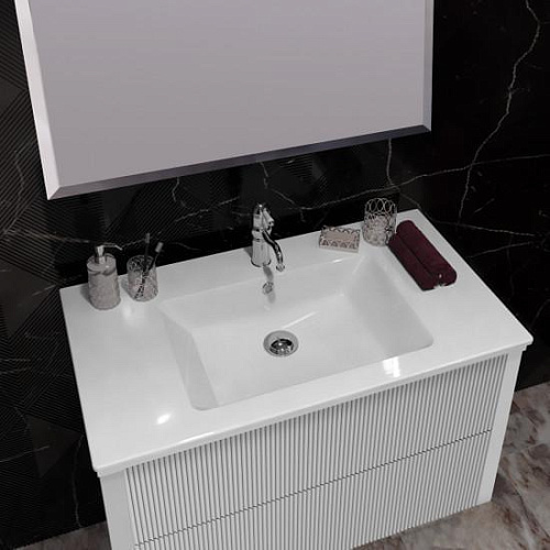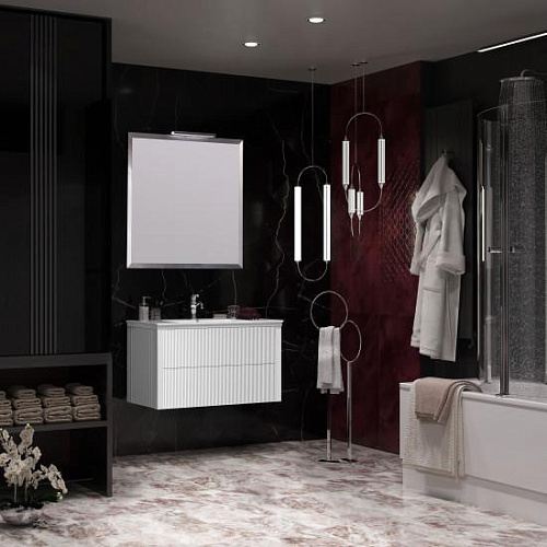 Коллекция РУБИННО исполнена по всем современным требованиям стиля для мебели в ванную комнату 2020 года. Рельефные фасады тумбы с технологией открывания push-to-open покрыты влагостойкой эмалью серого цвета. Мебель укомплектована ультратонкой керамической раковиной на две чаши, которая даёт возможность встречать каждое утро вдвоем. Зеркальное полотно с широким фацетом подчеркивает строгие формы коллекции, а светодиодный светильник над зеркалом освещает рабочее пространство.