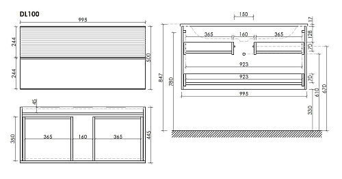 Тумба подвесная SANCOS Delta 995х445х500, c двумя ящиками оснащенными доводчиками скрытого монтажа с системой Soft close (плавного закрывания), ручки чёрные профильные накладные, дуб светлый/белый , арт. DL100W