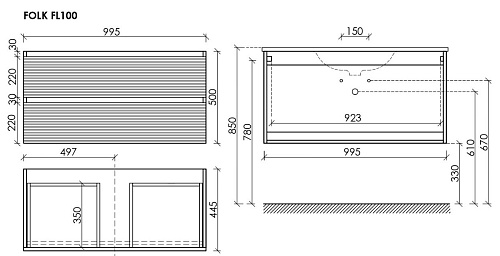 Тумба подвесная с рельефным фасадом SANCOS Folk 995х445х500, c двумя ящиками оснащенными доводчиками скрытого монтажа с системой плавного закрывания, цвет Bianco, арт.FL100W