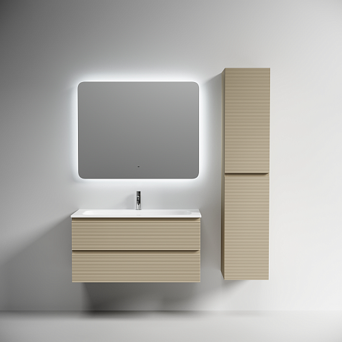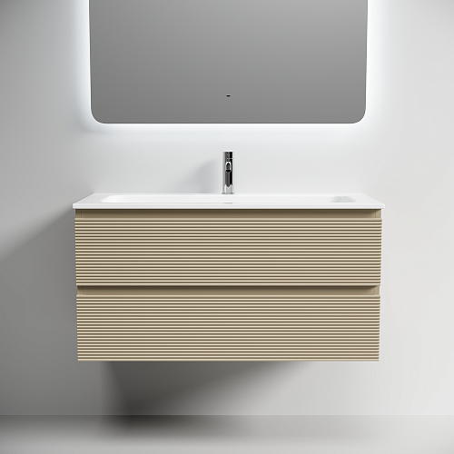 Тумба подвесная с двумя выдвижными ящиками с доводчиками скрытого монтажа Каркас и фасад тумбы выполнен из МДФ, покрытие ПВХ - пленка Размер 995х445х500 На изображении тумба Folk представлена с зеркалом RAY, смесителем из коллекции ETNA и раковинами Grace CN7013