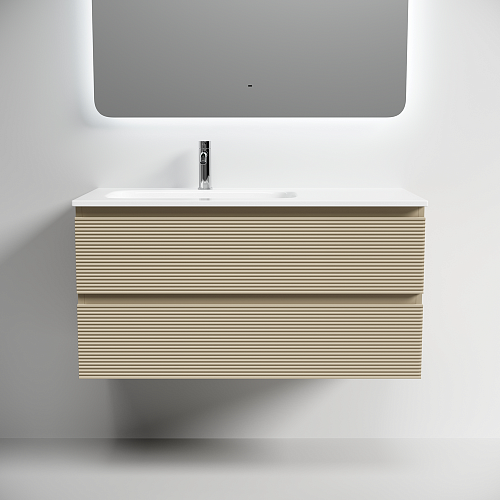 Тумба подвесная с двумя выдвижными ящиками с доводчиками скрытого монтажа Каркас и фасад тумбы выполнен из МДФ, покрытие ПВХ - пленка Размер 995х445х500, левая На изображении тумба Folk представлена с зеркалом RAY, смесителем из коллекции ETNA и раковинами Grace CN7014