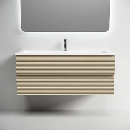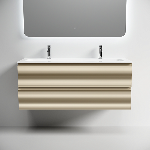 Тумба подвесная с двумя выдвижными ящиками с доводчиками скрытого монтажа Каркас и фасад тумбы выполнен из МДФ, покрытие ПВХ - пленка Размер 1190х445х500, правая На изображении тумба Folk представлена с зеркалом RAY, смесителем из коллекции ETNA и раковинами Grace CN7017 и СN7016