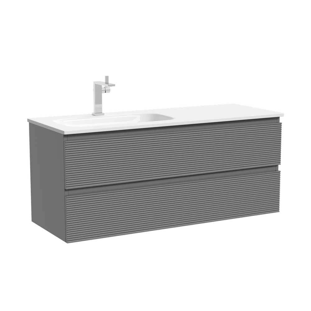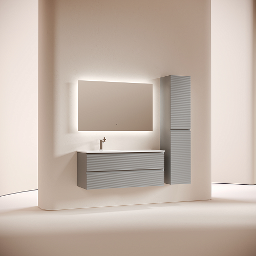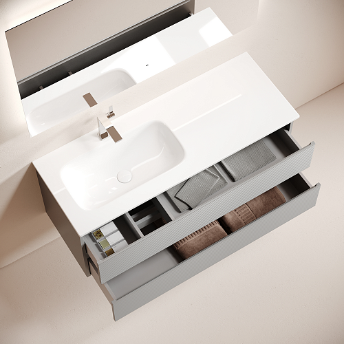 Тумба с двумя выдвижными ящиками и с доводчиками скрытого монтажа Выполнена из МДФ с покрытием ПВХ плёнка Комплектующие FIRMAX Цвет ergraut soft На изображении мебель Snob R представлена с зеркалом SQUARE 120 (SQ120 и смесителем из коллекции LINN (SC9019CH), раковиной Grace CN7020