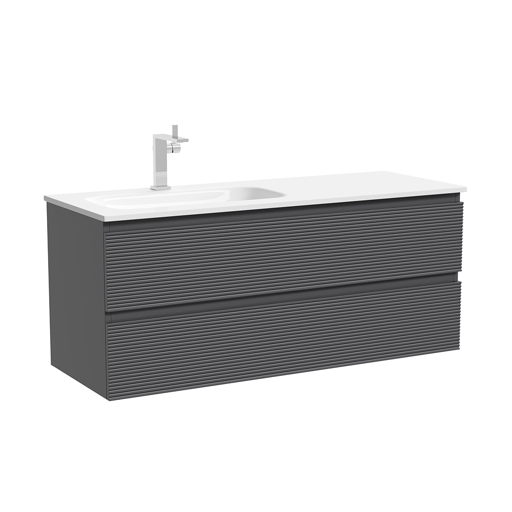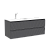 Тумба с двумя выдвижными ящиками и с доводчиками скрытого монтажа Выполнена из МДФ с покрытием ПВХ плёнка Комплектующие FIRMAX Цвет grey soft На изображении мебель Snob R представлена с зеркалом SQUARE 120 (SQ120 и смесителем из коллекции LINN (SC9019CH), раковиной Grace CN7020
