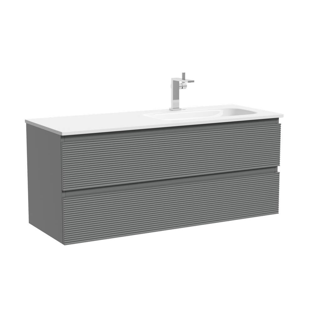 Тумба с двумя выдвижными ящиками и с доводчиками скрытого монтажа Выполнена из МДФ с покрытием ПВХ плёнка Комплектующие FIRMAX Цвет ergraut soft На изображении мебель Snob R представлена с зеркалом SQUARE 120 (SQ120 и смесителем из коллекции LINN (SC9019CH), раковиной Grace CN7021