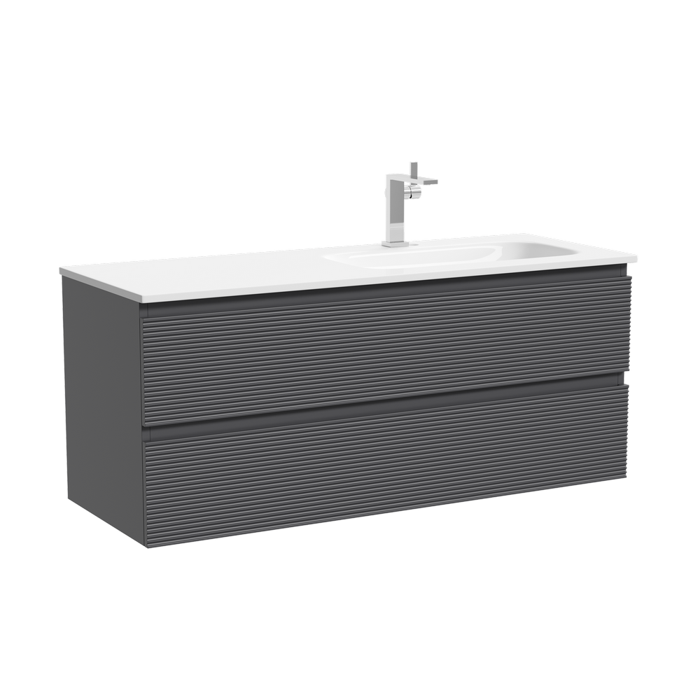 Тумба с двумя выдвижными ящиками и с доводчиками скрытого монтажа Выполнена из МДФ с покрытием ПВХ плёнка Комплектующие FIRMAX Цвет grey soft На изображении мебель Snob R представлена с зеркалом SQUARE 120 (SQ120 и смесителем из коллекции LINN (SC9019CH), раковиной Grace CN7021