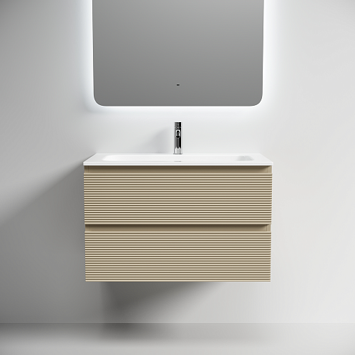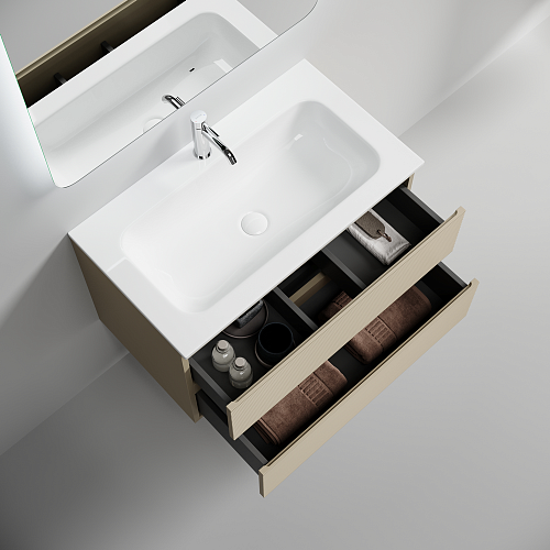Тумба подвесная с двумя выдвижными ящиками с доводчиками скрытого монтажа Каркас и фасад тумбы выполнен из МДФ, покрытие ПВХ - пленка Размер 790х445х500 На изображении тумба Folk представлена с зеркалом RAY, смесителем из коллекции ETNA и раковинами Grace CN7012