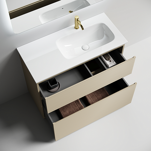 Тумба напольная с двумя выдвижными ящиками с доводчиками скрытого монтажа Каркас и фасад тумбы выполнен из МДФ, покрытие ПВХ - пленка Размер 995х445х850, правая В комплекте регулируемые ножки для невелирования неровностей пола до 10 мм На изображении тумба Folk Floor представлена с зеркалом RAY, смесителем из коллекции ETNA и раковиной Grace CN7015