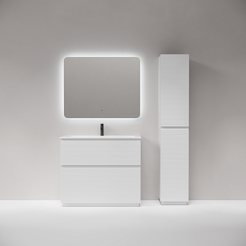 Тумба напольная с двумя выдвижными ящиками с доводчиками скрытого монтажа Каркас и фасад тумбы выполнен из МДФ, покрытие ПВХ - пленка Размер 995х445х850 В комплекте регулируемые ножки для невелирования неровностей пола до 10 мм На изображении тумба Folk Floor представлена с зеркалом RAY, смесителем из коллекции ETNA и раковиной Grace CN7013