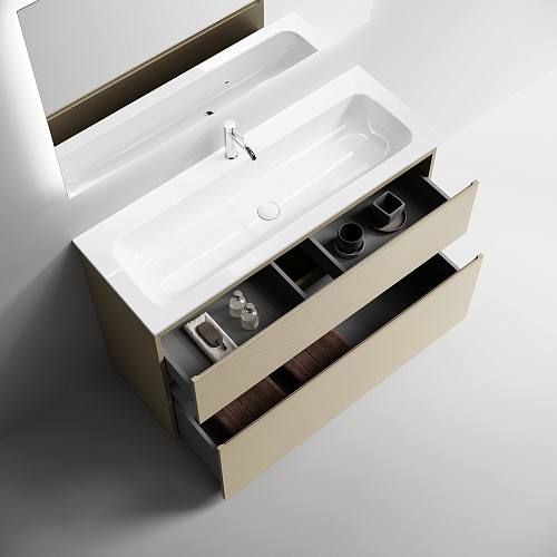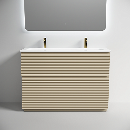 Тумба напольная с двумя выдвижными ящиками с доводчиками скрытого монтажа Каркас и фасад тумбы выполнен из МДФ, покрытие ПВХ - пленка Размер 1190х445х850 В комплекте регулируемые ножки для невелирования неровностей пола до 10 мм На изображении тумба Folk Floor представлена с зеркалом RAY, смесителем из коллекции ETNA и раковинами Grace CN7016, CN7017