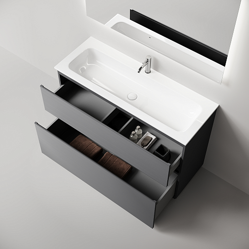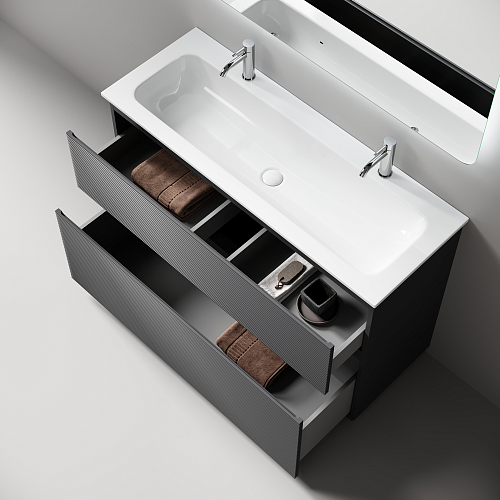 Тумба напольная с двумя выдвижными ящиками с доводчиками скрытого монтажа Каркас и фасад тумбы выполнен из МДФ, покрытие ПВХ - пленка Размер 1190х445х850 В комплекте регулируемые ножки для невелирования неровностей пола до 10 мм На изображении тумба Folk Floor представлена с зеркалом RAY, смесителем из коллекции ETNA и раковинами Grace CN7016, CN7017