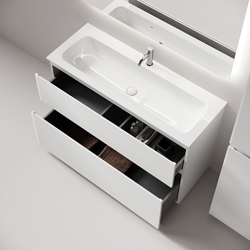 Тумба напольная с двумя выдвижными ящиками с доводчиками скрытого монтажа Каркас и фасад тумбы выполнен из МДФ, покрытие ПВХ - пленка Размер 1190х445х850 В комплекте регулируемые ножки для невелирования неровностей пола до 10 мм На изображении тумба Folk Floor представлена с зеркалом RAY, смесителем из коллекции ETNA и раковинами Grace CN7016, CN7017