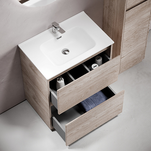 Тумба под раковину SANCOS Libra Floor напольная, 690х450х840 c двумя ящиками оснащенными доводчиками скрытого монтажа с системой Soft close (плавного закрывания), c фрезерованными ручками по всей длине фасада, дуб галифакс натуральный, арт.LB70FEG