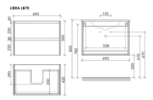 Тумба подвесная SANCOS Libra 690х450х500 c двумя ящиками оснащенными доводчиками скрытого монтажа с системой Soft close (плавного закрывания), c фрезерованными ручками по всей длине фасада, белый глянец , арт. LB70W