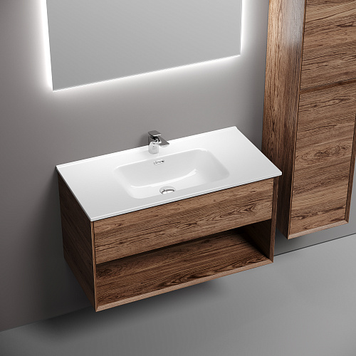 Тумба подвесная SANCOS Marmi 1.0 890х445х520 c одним ящиком оснащенным доводчиками скрытого монтажа с системой Soft close (плавного закрывания) и открытой нишей, c фрезерованной ручкой по всей длине фасада, дуб чарльстон, арт. MR1.090ECH