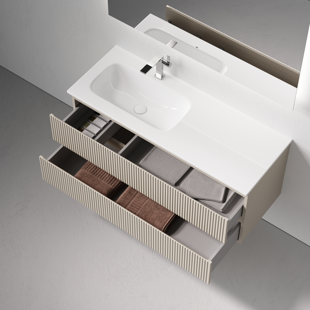Тумба с двумя выдвижными ящиками и с доводчиками скрытого монтажа Выполнена из МДФ с покрытием ПВХ плёнка Комплектующие FIRMAX Цвет beige soft На изображении мебель Snob R представлена с зеркалом SQUARE 120 (SQ120 и смесителем из коллекции LINN (SC9019CH), раковиной Grace CN7020