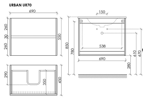 Тумба подвесная SANCOS Urban 690х450х550 c двумя ящиками оснащенными доводчиками скрытого монтажа с системой Soft close (плавного закрывания), c ручкой Gola по всей длине тумбы, белый глянец , арт. UR70W