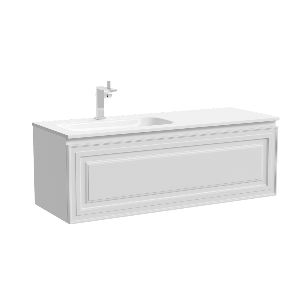 Тумба с одним выдвижным ящиком и с доводчиками скрытого монтажа Выполнена из МДФ с покрытием ПВХ плёнка Комплектующие FIRMAX Цвет bianco На изображении мебель Snob R представлена с зеркалом SQUARE 120 (SQ120 и смесителем из коллекции LINN (SC9019CH), раковиной Grace CN7020