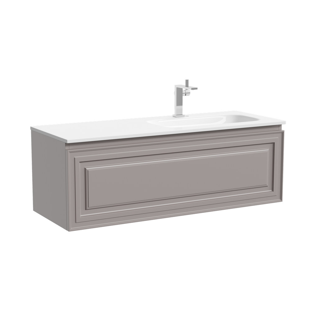 Тумба с одним выдвижным ящиком и с доводчиками скрытого монтажа Выполнена из МДФ с покрытием ПВХ плёнка Комплектующие FIRMAX Цвет doha soft На изображении мебель Snob R представлена с зеркалом SQUARE 120 (SQ120 и смесителем из коллекции LINN (SC9019CH), раковиной Grace CN7021