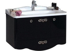 Изящный корпус тумбы, выполненный в стиле неоклассики идеально дополнит ваш интерьер и придаст ему свой неповторимый облик и стиль, а сочетание чёрной глянцевой поверхности и белого камня добавят ему элегантности. Классическая форма раковины выдержана в общем стиле с тумбой, и имеет высокие боковые и пристенные бортики, которые предотвращают разбрызгивание воды. Тумба снабжена удобным двухстворчатым шкафчиком с двумя полками, распашные фасады которого установлены на петли, со встроенным механизмом плавного довода, позволяющие дверцам закрываться бесшумно. Цвет: черный.