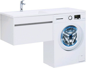 Тумба с раковиной Aquanet Токио 130 L (подвесная, 1 ящик) белого цвета представляет новый формат тумб производства Aquanet. Раковина из литьевого мрамора имеет длинную платформу, которая выходит далеко за пределы тумбы. Она предназначена для того, чтобы установить с правой стороны от тумбы стиральную машину. Платформа имеет такую длину, которая позволит спрятать под нее машинку средних размеров с фронтальной загрузкой. Корпус тумбы выполнен из влагостойкого ЛДСП, а фасад – из МДФ с покрытием эмалью. В подвесной тумбе шириной 680 мм место хранения предусмотрено в выдвижном ящике, оборудованном доводчиками, чтобы ход ящика при открывании/закрывании был плавным и без неприятных звуков. Тумбу можно использовать и без соседства со стиральной машиной, а свободное пространство под платформой раковины занять подкатной тумбой, полочками для полотенец или столиком.