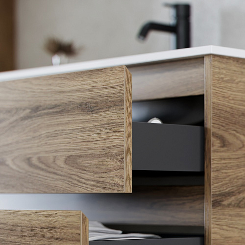 Тумба подвесная SANCOS Libra 890х450х500 c двумя ящиками оснащенными доводчиками скрытого монтажа с системой Soft close (плавного закрывания), c фрезерованными ручками по всей длине фасада, дуб чарльстон, арт. LB90ECH