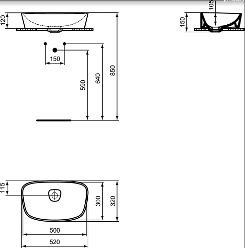 DEA Умывальник-чаша Vessel 52 см, без перелива, для монтажа со специальным донным клапаном J3291AA, с крепежом T654867, с монтажным шаблоном TT0299329, с керамической накладкой слива T852501, для монтажа соло с дизайн-сифоном или с мебелью DEA