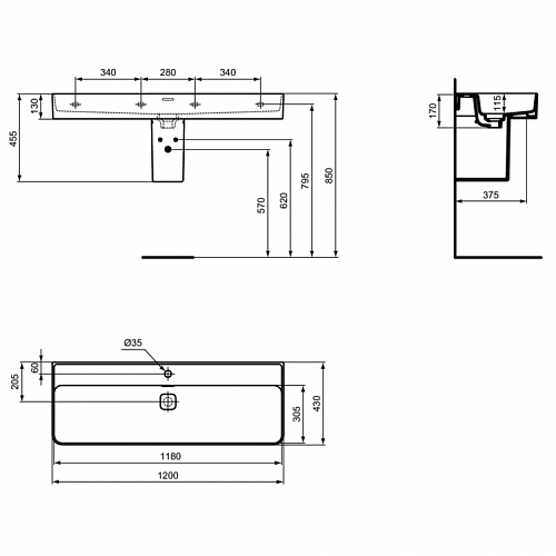 Раковина Ideal Standard T300601 Strada II подвесная 120х43 см, для монтажа с одним смесителем, Euro White (евробелый)