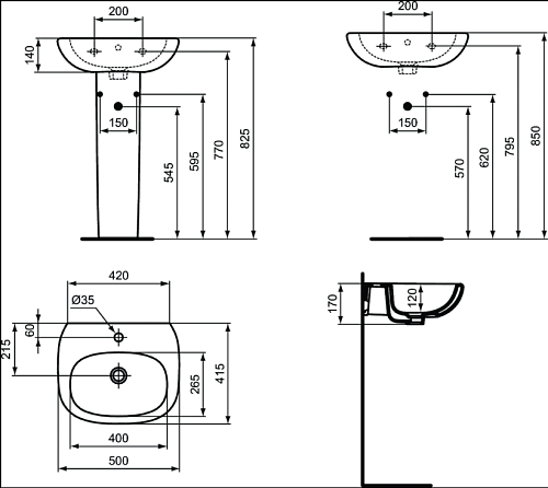TESI Умывальник 50 см для монтажа с сифоном, колонной или полуколонной, с отверстием под смеситель, с отверстием перелива, без крепежа