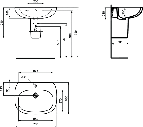 TESI Умывальник 70 см для монтажа с сифоном, колонной или полуколонной, с отверстием под смеситель, с отверстием перелива, без крепежа