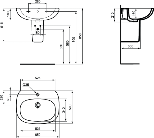 TESI Умывальник 65 см для монтажа с сифоном, колонной или полуколонной, с отверстием под смеситель, с отверстием перелива, без крепежа