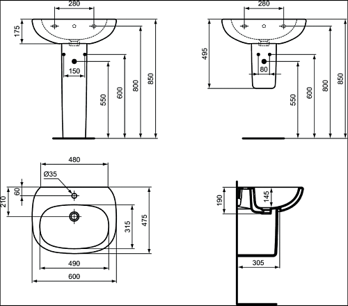 TESI Умывальник 60 см для монтажа с сифоном, колонной T033501 или полуколонной T033401, с отверстием под смеситель, с отверстием перелива, без крепежа