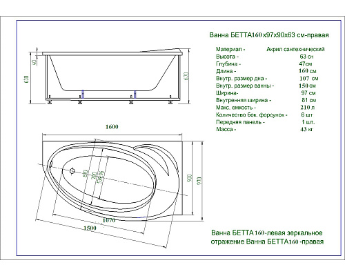 Оснащение • Ванна без гидромассажного оборудования • Каркас, слив-перелив в комплект не входят и поставляются отднльно • Фронтальный экран в комплект не входит и приобретается отдельно