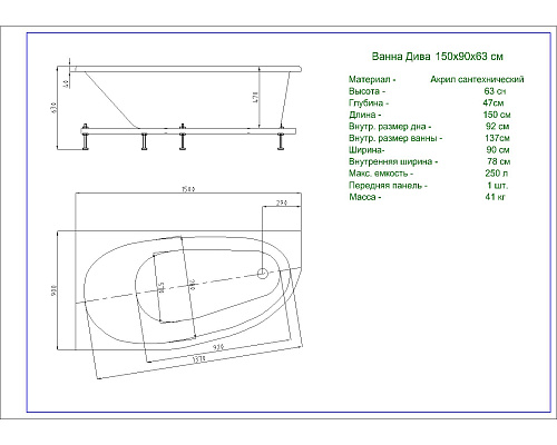 Оснащение • ванна акриловая • каркас (или Универсальная опора), слив-перелив, фронтальный и боковой экраны в комплект не входят и поставляются отдельно • установка гидромассажного оборудования не предусмотрена
