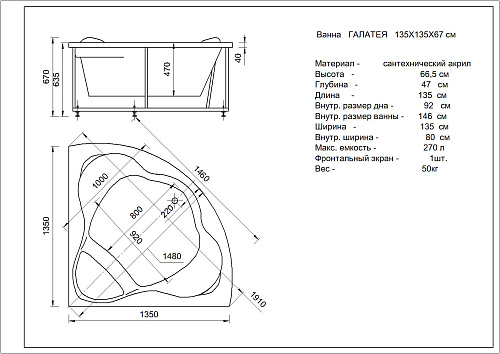 Оснащение • Ванна без гидромассажного оборудования • Вклеенный каркас • Слив-перелив • Фронтальный экран в комплект не входит и приобретается отдельно