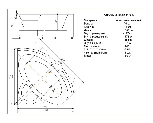 Оснащение • Ванна без гидромассажного оборудования • Вклеенный каркас • Слив-перелив • Фронтальный экран в комплект не входит и приобретается отдельно
